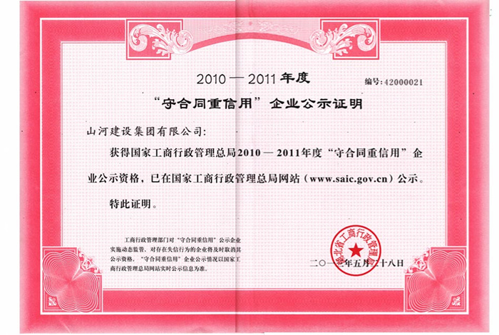 山河集團(tuán)榮獲國(guó)家工商總局2010―2011年度“守合同重信用”企業(yè)稱號(hào)
