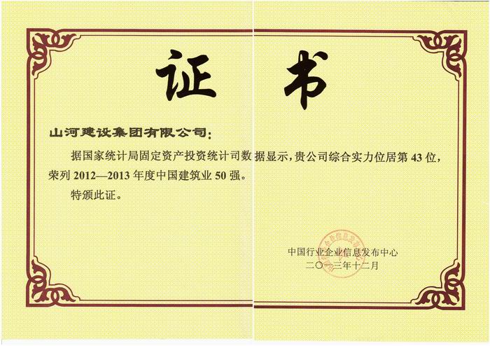 由國家統(tǒng)計局提供最新權威數(shù)據(jù)支持,中國行業(yè)企業(yè)信息發(fā)布中心主辦的“2013第十二屆中國建筑業(yè)50強測評成果發(fā)布暨頒獎典禮”于2013年12月在京舉行。會上發(fā)布了中國建筑業(yè)50強名單,山河集團位居第43名,提前兩年實現(xiàn)了山河集團 “二五”目標中的該項指標。