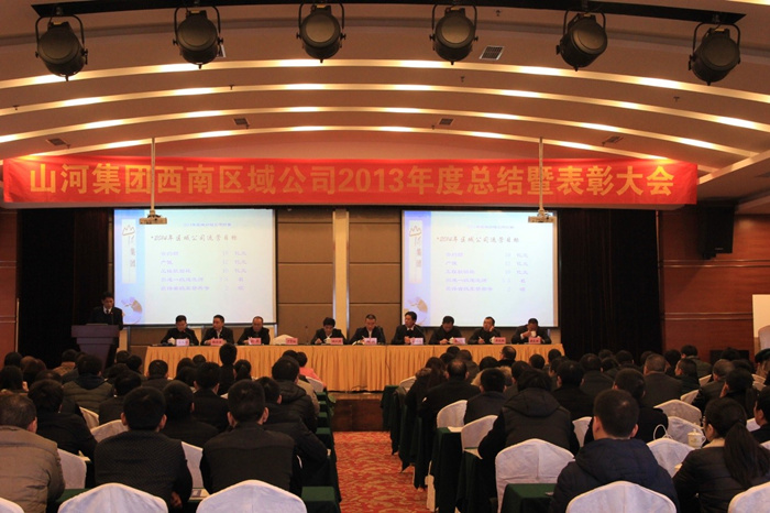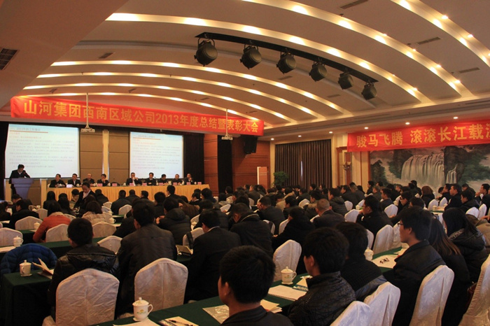 2013年12月28日,重慶鐵山東方山水假日酒店會(huì)議大廳內(nèi)張燈結(jié)彩,一派歡樂(lè)祥和的喜慶氣氛,山河集團(tuán)西南區(qū)域公司2013年度總結(jié)暨表彰大會(huì)在此隆重舉行。此次年會(huì)以“理清思路、升級(jí)管理、品牌共建、成果共享”為主題,公司領(lǐng)導(dǎo)和員工共聚一堂,在喜迎元旦佳節(jié)的同時(shí),總結(jié)過(guò)去、展望未來(lái),群策群力,共商發(fā)展大計(jì)。