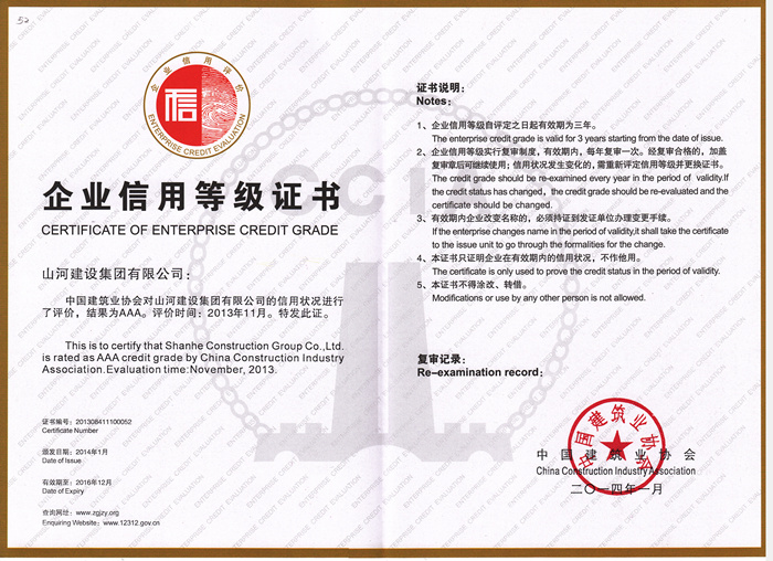 全國建筑業(yè)AAA級(jí)信用企業(yè)由中國建筑業(yè)協(xié)會(huì)頒發(fā),是建筑行業(yè)信用最高獎(jiǎng)項(xiàng)。此次評(píng)價(jià)嚴(yán)格按照《建筑業(yè)企業(yè)信用評(píng)價(jià)試行辦法》規(guī)定的程序進(jìn)行。經(jīng)企業(yè)自愿申報(bào)、各地區(qū)和有關(guān)行業(yè)、建筑業(yè)協(xié)會(huì)推薦、在建設(shè)系統(tǒng)相關(guān)網(wǎng)站上排查、專家評(píng)價(jià)組初評(píng)、全國建筑業(yè)企業(yè)信用評(píng)價(jià)工作指導(dǎo)委員會(huì)審定和網(wǎng)上公示。通過層層篩選,最終,包括山河建設(shè)集團(tuán)有限公司在內(nèi)的93家企業(yè)評(píng)定為2013年度全國建筑業(yè)AAA級(jí)信用企業(yè)。