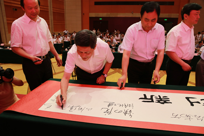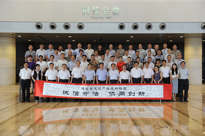 “維護建筑市場秩序,推行公平競爭,重合同,守信用,不做虛假宣傳,不逃避責任?!睍?,全國人大代表、山河集團董事長程理財代表省建筑產業(yè)聯盟企業(yè)作出鄭重承諾。隨后,產業(yè)聯盟成員單位現場簽名,共同發(fā)起“誠信守法 協同創(chuàng)新”倡議。