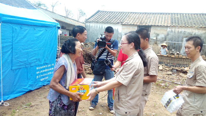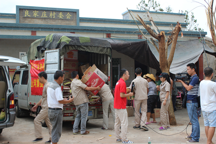 與此同時,海南各地都是眾志成城的救災(zāi)場面,一方有難,八方支援。山河集團(tuán)在開展自救的同時,心系災(zāi)民,當(dāng)?shù)弥貫?zāi)區(qū)文昌部分村鎮(zhèn),由于交通偏僻,信息不暢,得不到及時救助,災(zāi)民的生活非常的艱難時,山河人心急如焚。山河集團(tuán)已進(jìn)駐海南6年,扎根海南、情系海南。在災(zāi)難面前,山河人勇于擔(dān)當(dāng),自發(fā)的組織捐款10萬余元,采購了幾噸急需生活物資,如米、油、水、食品、藥品等。7月26日,在海口熱帶播報記者的帶領(lǐng)下,公司組織員工來到了一線災(zāi)區(qū)文昌市錦山鎮(zhèn)良民村。 當(dāng)我們來到該村時,村民已等待多時,看到我們的到來非常的激動。當(dāng)時下著大雨,村民們顧不上遮蓋自家的屋頂、收拾東西,都趕來搬運(yùn)救災(zāi)物資,雨水、汗水、淚水流淌在臉上,感激之情流淌在心間。在村長的帶領(lǐng)下,我們見到了村里的低保戶年邁的阿婆,她老無所倚,幾年前她兒子去逝了,幾天前兒媳重病也去逝了,現(xiàn)只剩下小孫兒相依為命,臺風(fēng)又讓這個本來很不幸的家庭受到重創(chuàng),她們失去了僅有的一間住所,現(xiàn)寄住在只有幾個平方的一個臨時的帳篷里,當(dāng)我們把米、油等物資送到阿婆的手中時,她熱淚盈眶,緊握我們的雙手,不停的道謝,看到老人的悲痛淚水,我們不禁心酸,淚水打濕了眼眶。我們鼓勵她建立對生活的信心,同時也希望社會給予她更多的關(guān)愛,讓她的晚年生活無憂。
