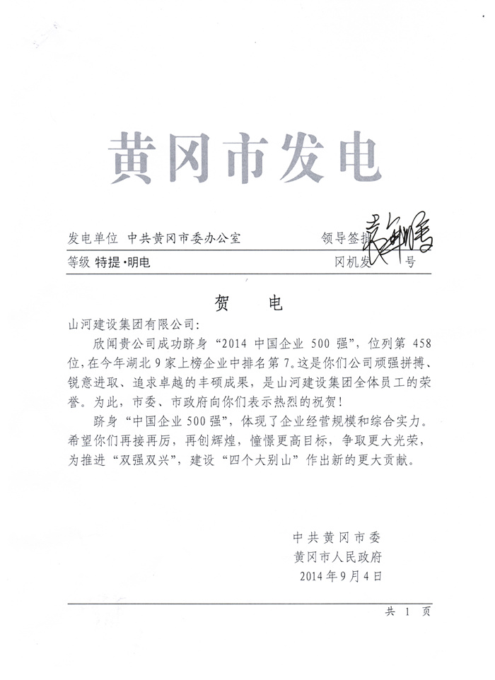 中共黃岡市委、黃岡市人民政府賀電