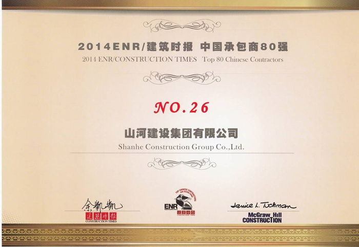 美國(guó)《工程新聞?dòng)涗洝罚‥NR)和中國(guó)《建筑時(shí)報(bào)》兩家權(quán)威媒體共同主辦的2014年ENR/建筑時(shí)報(bào)“中國(guó)承包商80強(qiáng)和工程設(shè)計(jì)企業(yè)60強(qiáng)”排名于11月20日在北京揭榜。山河集團(tuán)再次榜上有名,同比去年上升11位,排名列第26位,也是排行榜中湖北建筑企業(yè)第一名。