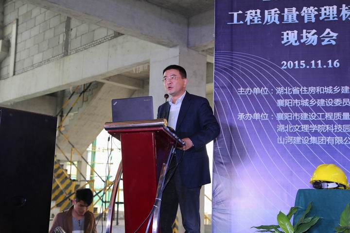 11月16日上午,湖北省工程質(zhì)量管理標(biāo)準(zhǔn)化現(xiàn)場會在湖北文理學(xué)院科技園工研院項目召開。省質(zhì)安總站副站長董文斌,襄陽市建委副主任盧一平、質(zhì)檢站黨委書記倪海青、站長張林、副站長黃先明,湖北文理學(xué)院校黨委常委副校長魏躍春,湖北文理學(xué)院科技園發(fā)展有限公司副總經(jīng)理寇國良,山河集團(tuán)常務(wù)副總經(jīng)理兼湖北公司總經(jīng)理林中茂、湖北公司副總經(jīng)理羅定軍、詹必強(qiáng)等參加了會議。襄陽市工程質(zhì)量監(jiān)督檢查站站長張林主持會議。