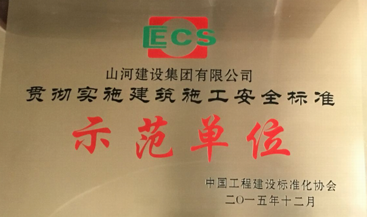 2015年12月,中國工程建設(shè)標(biāo)準(zhǔn)化協(xié)會施工安全專業(yè)委員會召開了貫徹實施建筑施工安全標(biāo)準(zhǔn)示范單位表彰大會,山河集團(tuán)榮獲“2015年度全國貫徹實施建筑施工安全標(biāo)準(zhǔn)示范單位”榮譽稱號。