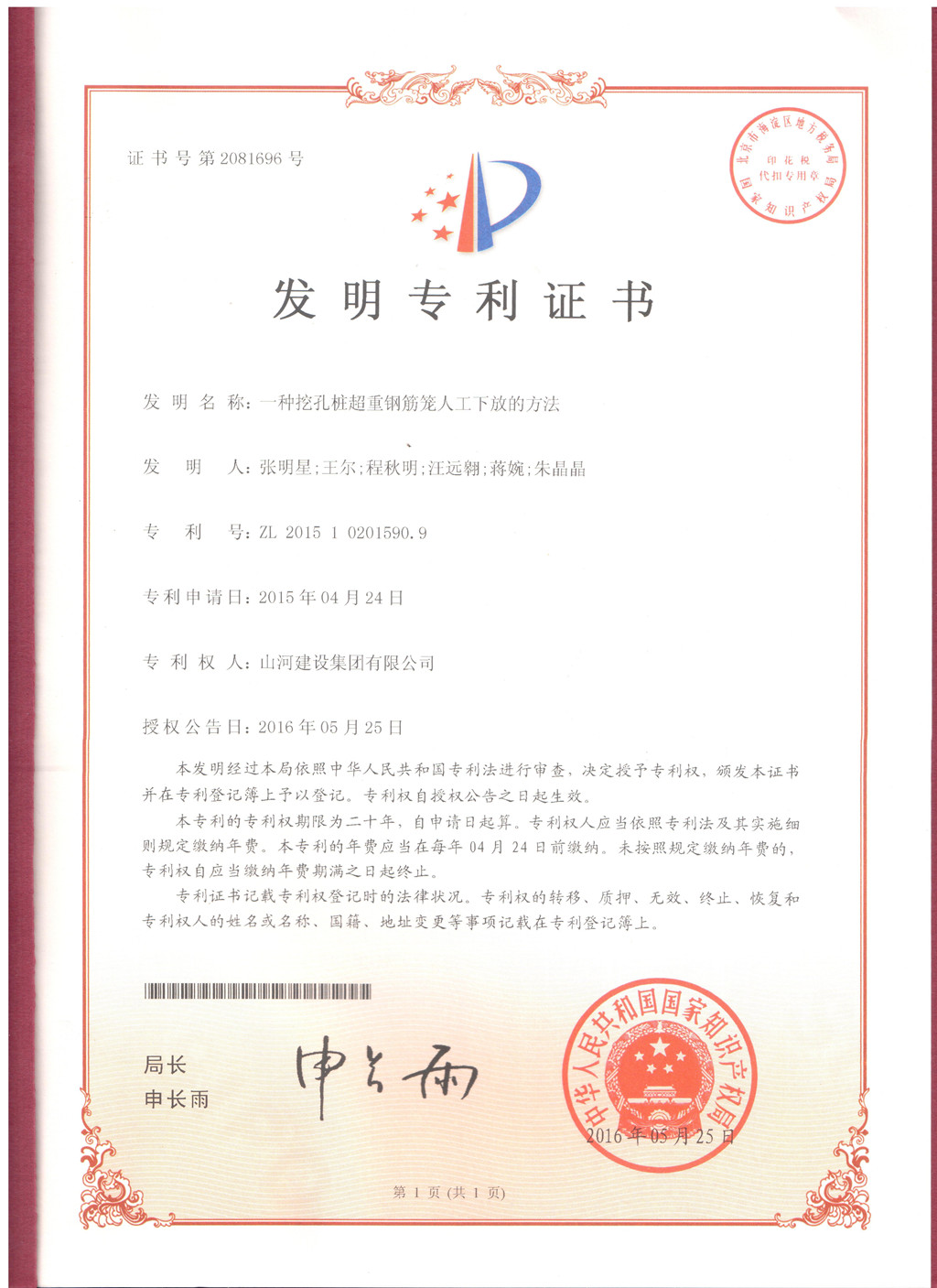 7月4日,山河集團技術(shù)發(fā)展中心研發(fā)的“一種挖孔樁超重鋼筋籠人工下放的方法”獲得由國家知識產(chǎn)權(quán)局授權(quán)的發(fā)明專利(專利號:ZL201510201590.9)。這是繼去年獲得一項發(fā)明專利后,山河集團再一次獲得發(fā)明專利,實現(xiàn)了科技的進步與技術(shù)的創(chuàng)新。