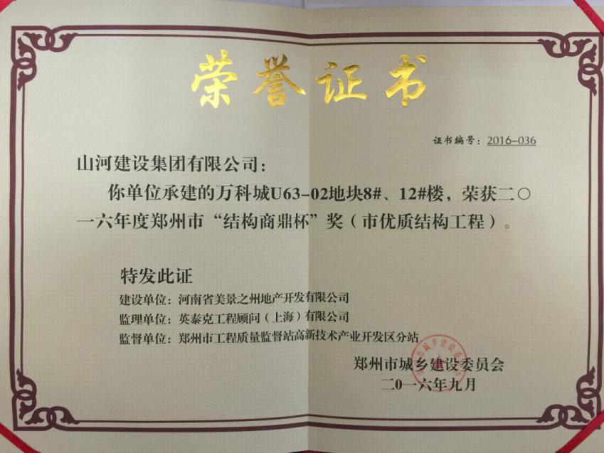 近日,從鄭州市城鄉(xiāng)建設委員會再次傳來喜訊,山河集團河南公司承建的萬科城U63-02地塊的8#、12#樓榮獲2016年度鄭州市“結構商鼎杯”(市優(yōu)質(zhì)結構工程)獎。這是該項目繼2016年3月獲得“鄭州市建筑施工安全生產(chǎn)標準化示范項目”后,再獲殊榮。