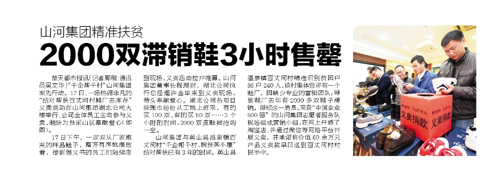 “千企幫千村“山河集團(tuán)率先行動(dòng)。11月17日,一場(chǎng)熱鬧非凡的“結(jié)對(duì)幫扶百丈河村鞋廠去庫(kù)存”義賣(mài)活動(dòng)在山河集團(tuán)湖北公司大樓舉行,公司全體員工主動(dòng)參與義賣(mài),踴躍為貧困區(qū)奉獻(xiàn)愛(ài)心。