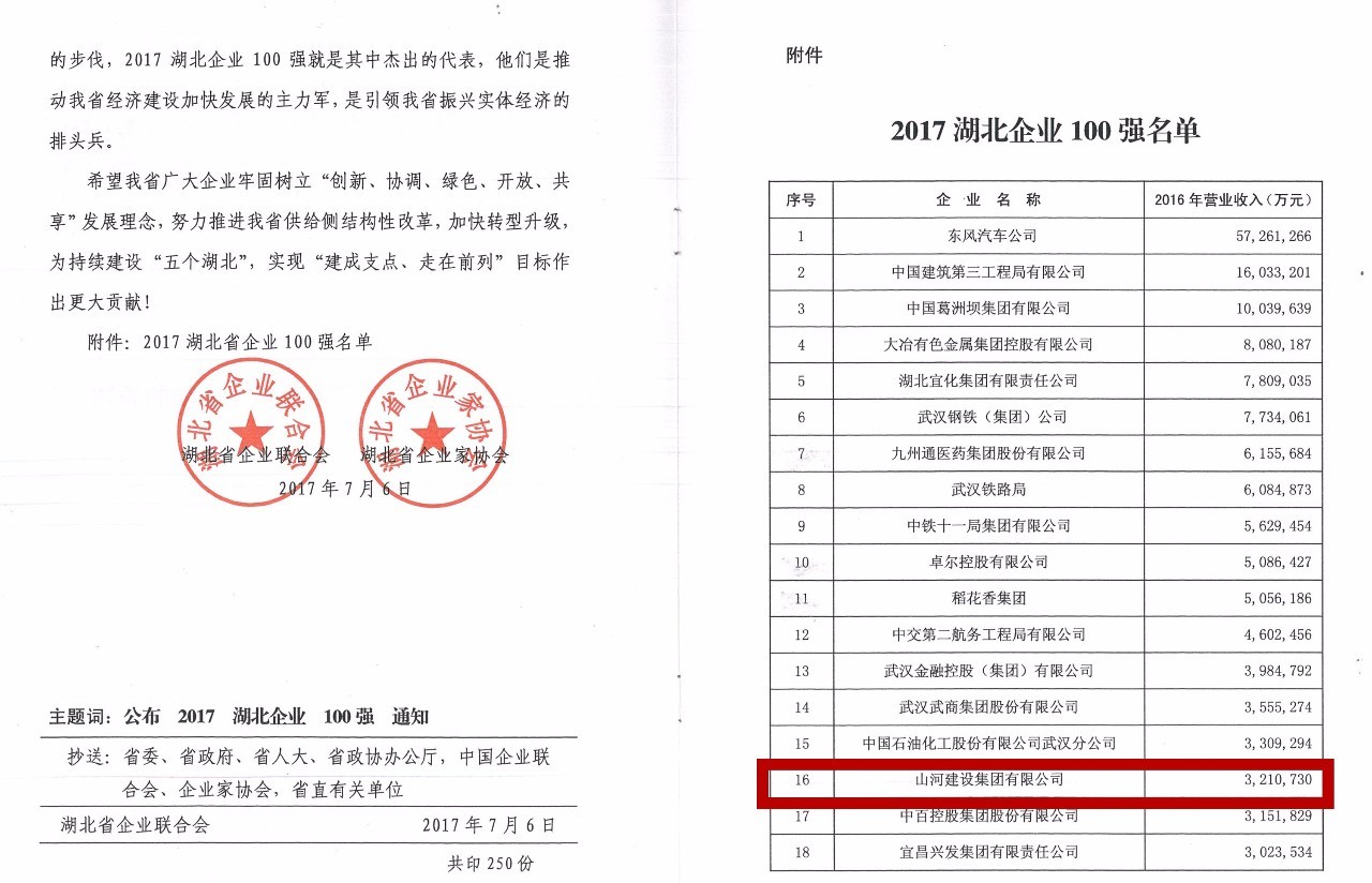 “荊楚風云匯,百強戰(zhàn)鼓擂”。7月6日,湖北省企業(yè)聯(lián)合會、湖北省企業(yè)家協(xié)會發(fā)布“2017湖北企業(yè)100強”榜單。山河集團2016年度以營業(yè)收入321.073億元的實績名列2017湖北企業(yè)100強第16位,較去年第17位又上升了1位。
