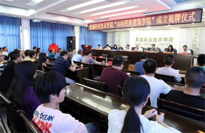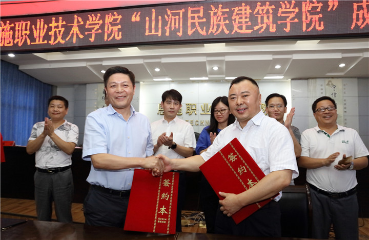 會上,恩施職業(yè)技術(shù)學(xué)院院長張捷致辭;山河集團(tuán)人力資源總監(jiān)李穎宣讀校企合作辦學(xué)協(xié)議書;集團(tuán)董事長程理財與恩施職業(yè)技術(shù)學(xué)院院長張捷進(jìn)行聯(lián)合辦學(xué)現(xiàn)場簽約,并共同為“山河民族建筑學(xué)院”揭牌。