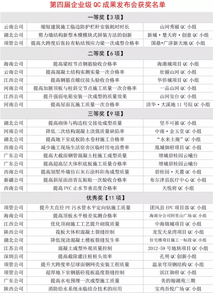 經(jīng)過專家組綜合評審,《縮短建筑施工臨邊防護欄桿安裝耗時時長》等3項成果榮獲一等獎,《提高梁柱節(jié)點鋼筋驗收合格率》等6項成果榮獲二等獎,《提高砌體與構造柱交接處成型質(zhì)量》等9項成果榮獲三等獎,《提升大直徑PE污水管水平定向鉆施工質(zhì)量》等11項成果榮獲優(yōu)秀獎。
