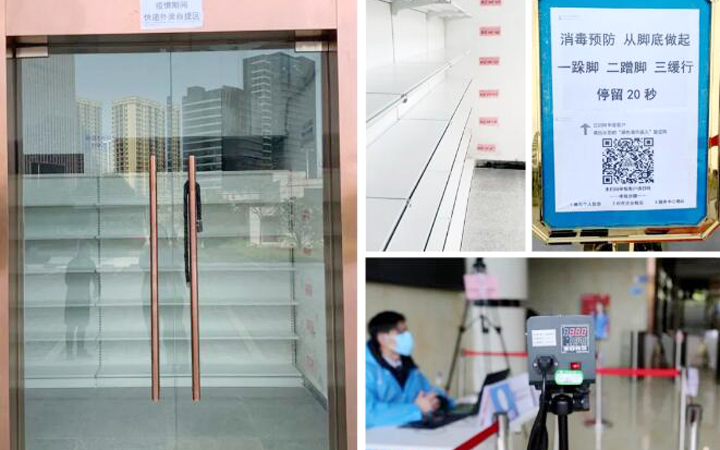 大廈一樓開辟了快遞外賣自提區(qū),入口處設(shè)置消毒通道,大堂安裝紅外線體溫檢測儀,物業(yè)服務(wù)中心提供免洗消毒洗手液,放置廢棄口罩專用垃圾桶,各種溫馨提示牌隨處可見,一系列消毒防護(hù)措施“妥妥的”。
