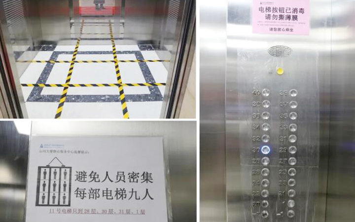 疫情期間,電梯實(shí)行“分區(qū)分層”管控,轎廂地面劃分為九宮格,由工作人員進(jìn)行引導(dǎo)。電梯轎廂每小時(shí)固定消毒一次,乘梯人員離開后,轎廂內(nèi)安裝的紫外線消毒設(shè)備也會(huì)自動(dòng)進(jìn)行消毒,電梯按鍵保護(hù)膜每日更換,規(guī)避潛在的交叉感染可能。