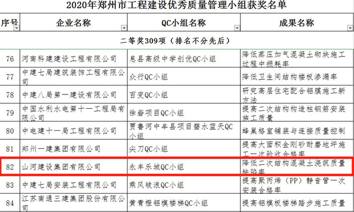 3月23日,鄭州市建筑業(yè)協(xié)會發(fā)布《關于表彰2020年鄭州市工程建設優(yōu)秀質(zhì)量管理小組活動成果的通知》,山河建設集團河南公司申報的三項成果榜上有名,恒大珺睿府二期QC小組獲得一等獎,清華憶江南二期QC小組、永豐樂城QC小組分別獲得二等獎。