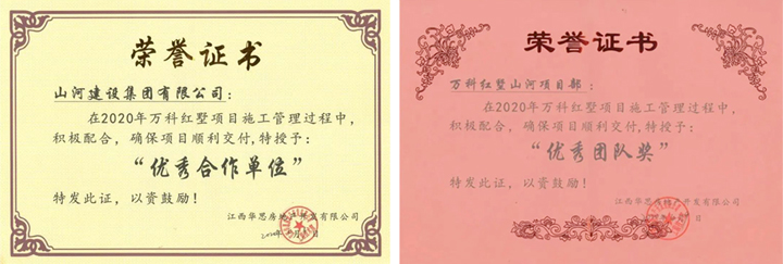 4月9日,山河建設集團江西公司被江西華思房地產(chǎn)開發(fā)有限公司授予“優(yōu)秀合作單位”稱號,表彰江西公司承建的萬科紅墅項目在施工管理過程中積極配合,確保項目順利交付。同時,萬科紅墅山河項目部榮獲“優(yōu)秀團隊獎”。