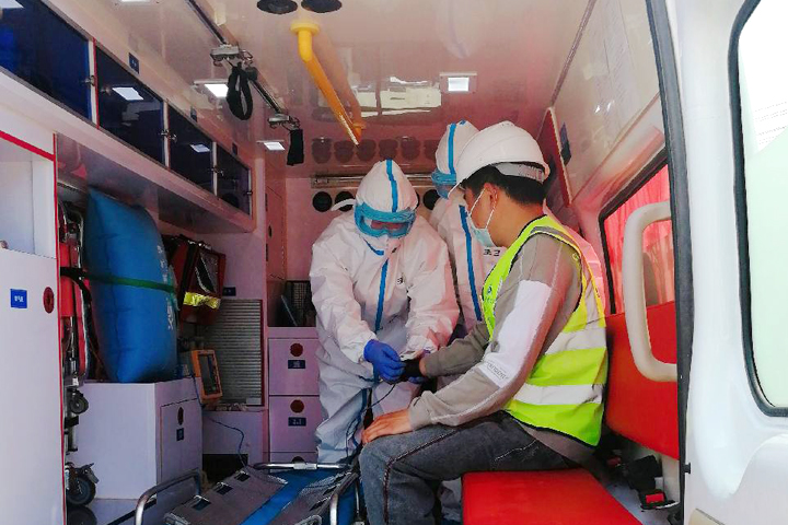 救護(hù)車閃著紅燈呼嘯而來,醫(yī)護(hù)人員對疑似感染人員進(jìn)行了初步的體溫、血氧、血壓等檢查后,將其送到鄂鋼醫(yī)院進(jìn)行詳細(xì)檢查。