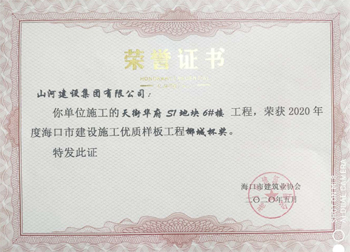 5月13日,山河建設(shè)集團(tuán)海南公司承建的天街華府S1地塊6#樓喜獲2020年度海口市建設(shè)施工優(yōu)質(zhì)樣板工程“椰城杯”獎(jiǎng)項(xiàng),這是海口市建設(shè)工程質(zhì)量最高榮譽(yù)。