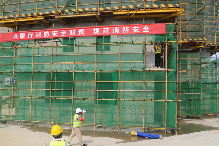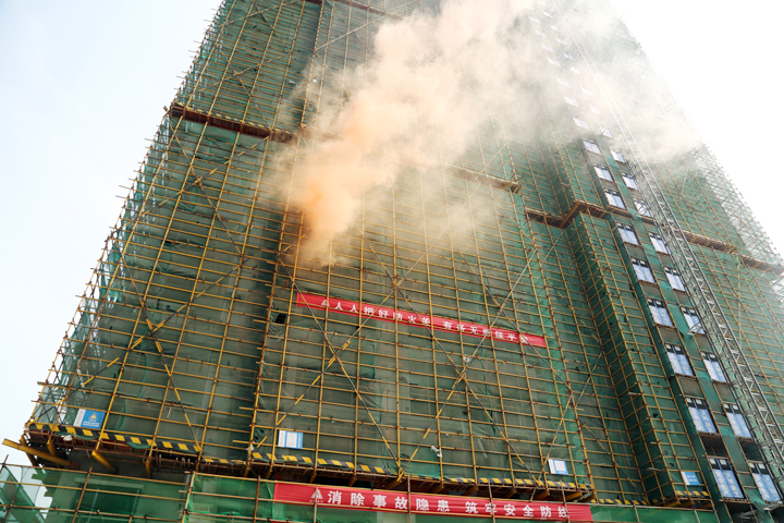 “失火了!”一聲尖銳急迫的叫喊聲,打破了工地的寧?kù)o。隨著消防煙霧彈的開(kāi)啟,在建大樓頓時(shí)濃煙滾滾,“火勢(shì)”迅速向四周蔓延。