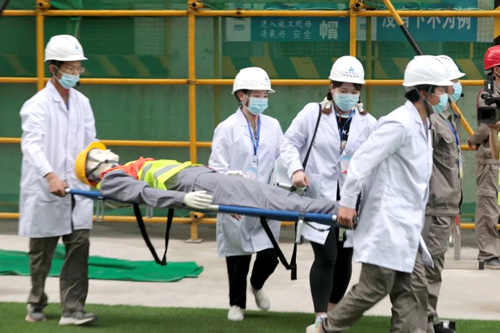 項目經(jīng)理發(fā)出指令,立即啟動應急救援預案,同時撥打120求助,并向上級單位報告。警戒隔離組、搶險救援組、醫(yī)療救護組先后進入事發(fā)區(qū)域,拉設警戒區(qū),檢查傷者情況并進行初步包扎處理,撤離作業(yè)人員,將傷者抬上擔架送上救護車,一系列行動有力有序,“受傷工人”得到了及時救治。