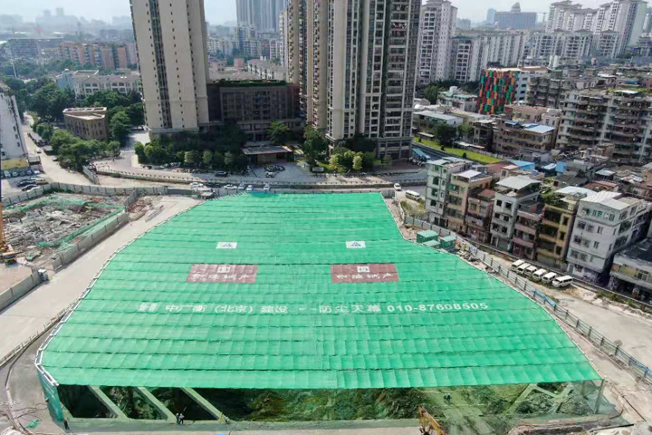 石崗路項(xiàng)目位于廣州市海珠區(qū)石溪村得寶球場旁,鄰近地鐵10號線石溪站,總建筑面積約6.5萬平方米,包括3棟36層、建筑高度116.2米的高層住宅。工程周邊環(huán)境復(fù)雜、裸土面積大、施工工序多,大跨度防塵天幕系統(tǒng)的啟用,開創(chuàng)了廣州基坑工程“全封閉”施工的先河。