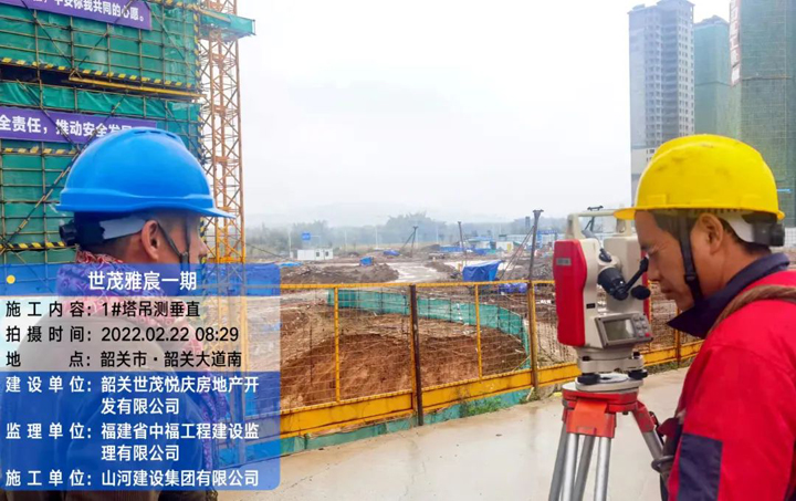 韶關(guān)世貿(mào)雅宸一期項(xiàng)目技術(shù)人員在測(cè)量塔吊垂直度