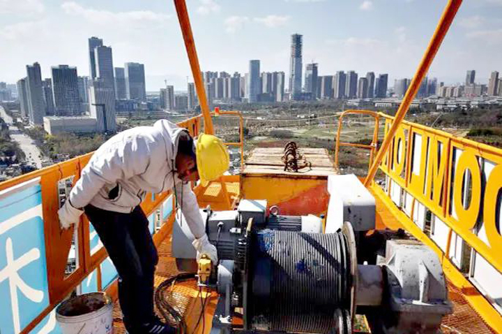 昆明龍四地塊棚改項(xiàng)目施工人員在檢查塔吊