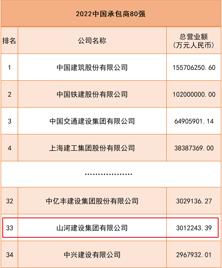 會上公布的“中國承包商80強”榜單上,山河建設集團名列第33位。2022年度“中國承包商80強”以2021年度企業(yè)工程承包營業(yè)收入作為主要排名依據(jù),展示了新一屆中國建筑業(yè)行業(yè)領軍者的風采。