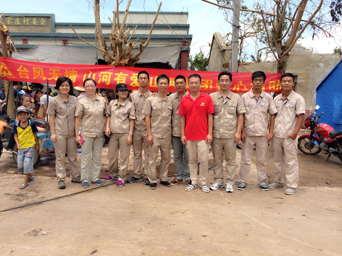 與此同時,海南各地都是眾志成城的救災(zāi)場面,一方有難,八方支援。山河集團(tuán)在開展自救的同時,心系災(zāi)民,當(dāng)?shù)弥貫?zāi)區(qū)文昌部分村鎮(zhèn),由于交通偏僻,信息不暢,得不到及時救助,災(zāi)民的生活非常的艱難時,山河人心急如焚。山河集團(tuán)已進(jìn)駐海南6年,扎根海南、情系海南。在災(zāi)難面前,山河人勇于擔(dān)當(dāng),自發(fā)的組織捐款10萬余元,采購了幾噸急需生活物資,如米、油、水、食品、藥品等。7月26日,在海口熱帶播報記者的帶領(lǐng)下,公司組織員工來到了一線災(zāi)區(qū)文昌市錦山鎮(zhèn)良民村。 當(dāng)我們來到該村時,村民已等待多時,看到我們的到來非常的激動。當(dāng)時下著大雨,村民們顧不上遮蓋自家的屋頂、收拾東西,都趕來搬運(yùn)救災(zāi)物資,雨水、汗水、淚水流淌在臉上,感激之情流淌在心間。在村長的帶領(lǐng)下,我們見到了村里的低保戶年邁的阿婆,她老無所倚,幾年前她兒子去逝了,幾天前兒媳重病也去逝了,現(xiàn)只剩下小孫兒相依為命,臺風(fēng)又讓這個本來很不幸的家庭受到重創(chuàng),她們失去了僅有的一間住所,現(xiàn)寄住在只有幾個平方的一個臨時的帳篷里,當(dāng)我們把米、油等物資送到阿婆的手中時,她熱淚盈眶,緊握我們的雙手,不停的道謝,看到老人的悲痛淚水,我們不禁心酸,淚水打濕了眼眶。我們鼓勵她建立對生活的信心,同時也希望社會給予她更多的關(guān)愛,讓她的晚年生活無憂。