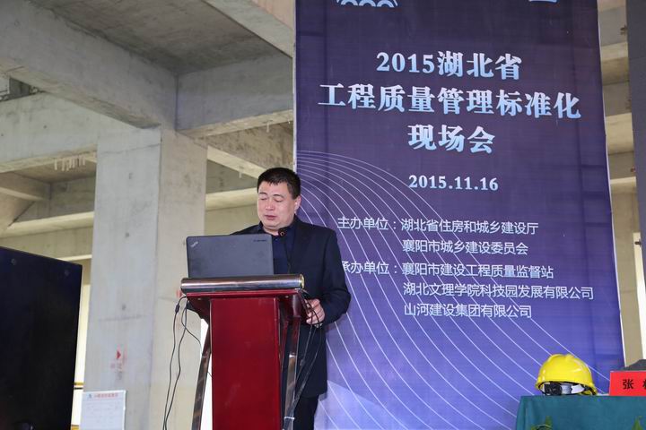 11月16日上午,湖北省工程質(zhì)量管理標(biāo)準(zhǔn)化現(xiàn)場會在湖北文理學(xué)院科技園工研院項目召開。省質(zhì)安總站副站長董文斌,襄陽市建委副主任盧一平、質(zhì)檢站黨委書記倪海青、站長張林、副站長黃先明,湖北文理學(xué)院校黨委常委副校長魏躍春,湖北文理學(xué)院科技園發(fā)展有限公司副總經(jīng)理寇國良,山河集團(tuán)常務(wù)副總經(jīng)理兼湖北公司總經(jīng)理林中茂、湖北公司副總經(jīng)理羅定軍、詹必強(qiáng)等參加了會議。襄陽市工程質(zhì)量監(jiān)督檢查站站長張林主持會議。