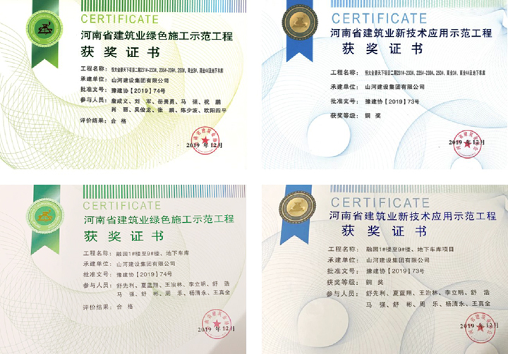 公司承建的恒大金碧天下項目、融創(chuàng)融園項目分別榮獲河南省綠色施工示范工程、河南省新技術(shù)應(yīng)用銅獎各1項。這兩個項目在滿足立項要求后積極準(zhǔn)備立項工作,施工過程中嚴(yán)格按照《河南省建筑業(yè)綠色施工示范工程管理辦法(試行)》《河南省建筑業(yè)新技術(shù)應(yīng)用示范工程管理辦法》的要求,堅持高標(biāo)準(zhǔn)建設(shè),確保高質(zhì)量完工,及時收集并準(zhǔn)備評審資料,順利通過了評審。