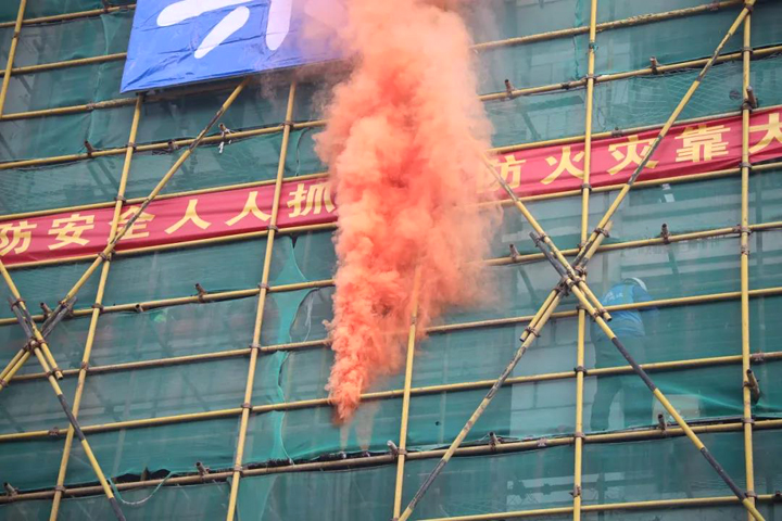“失火了!”一陣急促的喊聲打破了施工現(xiàn)場的平靜,一股“濃煙”從正在建設(shè)的樓棟里冒出,形勢緊急。“立即啟動應(yīng)急救援預(yù)案!應(yīng)急小組各就各位!”隨著項目經(jīng)理一聲令下,“事故現(xiàn)場”迅速展開救援……