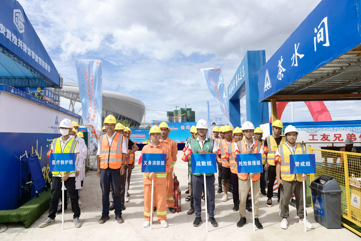 6月9日,山河建設(shè)集團(tuán)海南公司承建的萬(wàn)寧紅星美凱龍三標(biāo)段項(xiàng)目施工現(xiàn)場(chǎng)人頭攢動(dòng),萬(wàn)寧市2021年安全生產(chǎn)月啟動(dòng)儀式暨安全應(yīng)急演練現(xiàn)場(chǎng)觀摩會(huì)在這里舉行。萬(wàn)寧市住房和城鄉(xiāng)建設(shè)局局長(zhǎng)陳云鋒,建設(shè)工程質(zhì)量安全監(jiān)督站站長(zhǎng)嚴(yán)云,安委辦主任、應(yīng)急管理局局長(zhǎng)林靖等領(lǐng)導(dǎo)出席活動(dòng),海南公司常務(wù)副總經(jīng)理程智、工程團(tuán)隊(duì)、項(xiàng)目管理人員及建設(shè)單位、監(jiān)理單位、萬(wàn)寧市各在建項(xiàng)目代表等300余人參加了活動(dòng)。