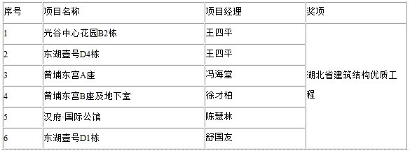 2008年4月9日,《湖北日報》第六版專版刊登《湖北省建設(shè)工程質(zhì)量安全協(xié)會公告》。根據(jù)《湖北省建筑結(jié)構(gòu)優(yōu)質(zhì)工程評審辦法》,湖北省建設(shè)工程質(zhì)量安全協(xié)會組織開展了2007年度省建筑結(jié)構(gòu)優(yōu)質(zhì)工程評選活動,經(jīng)對申報工程初審、核查和省建筑優(yōu)質(zhì)工程評審,全省有323項工程榮獲2007年度湖北省建筑結(jié)構(gòu)優(yōu)質(zhì)工程獎,其中,山河集團有光谷中心花園、東湖壹號、黃埔東宮、漢府?國際公館等6項工程獲此獎項。具體如下表: